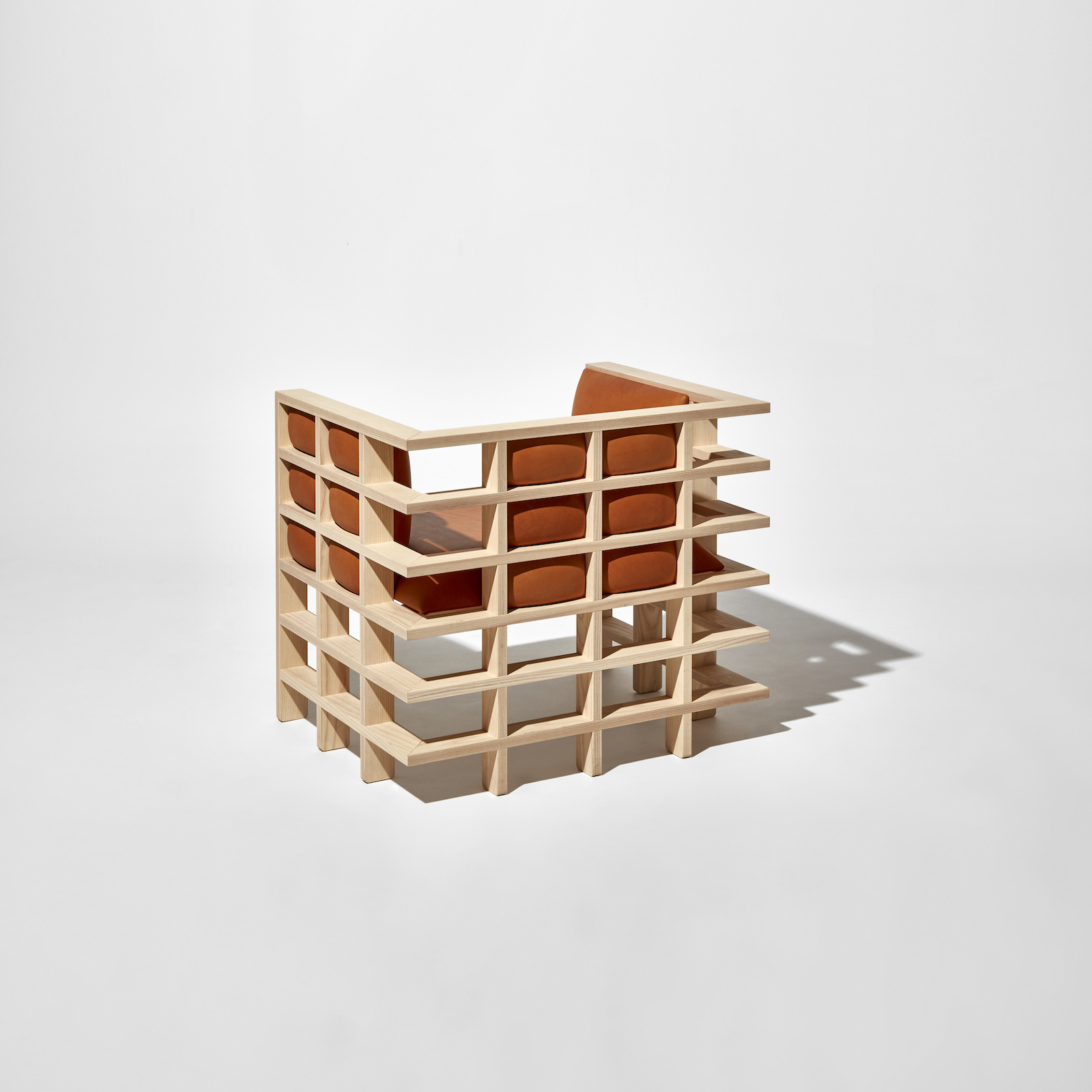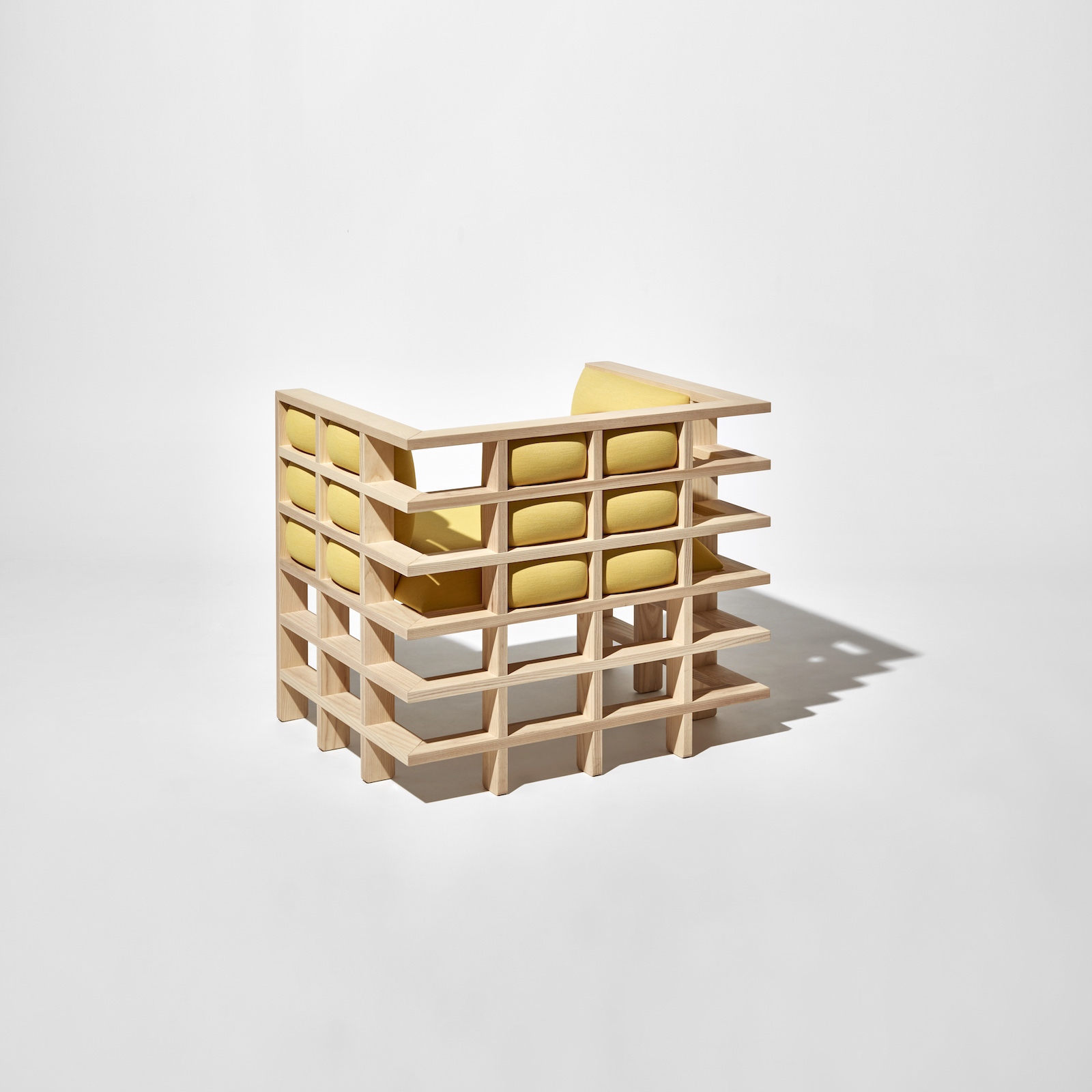 The upholstered grid spaces takes on sculptural qualities with their tactile bulge emphasising the contrast between soft and hard materials. Available exclusively through DesignByThem.