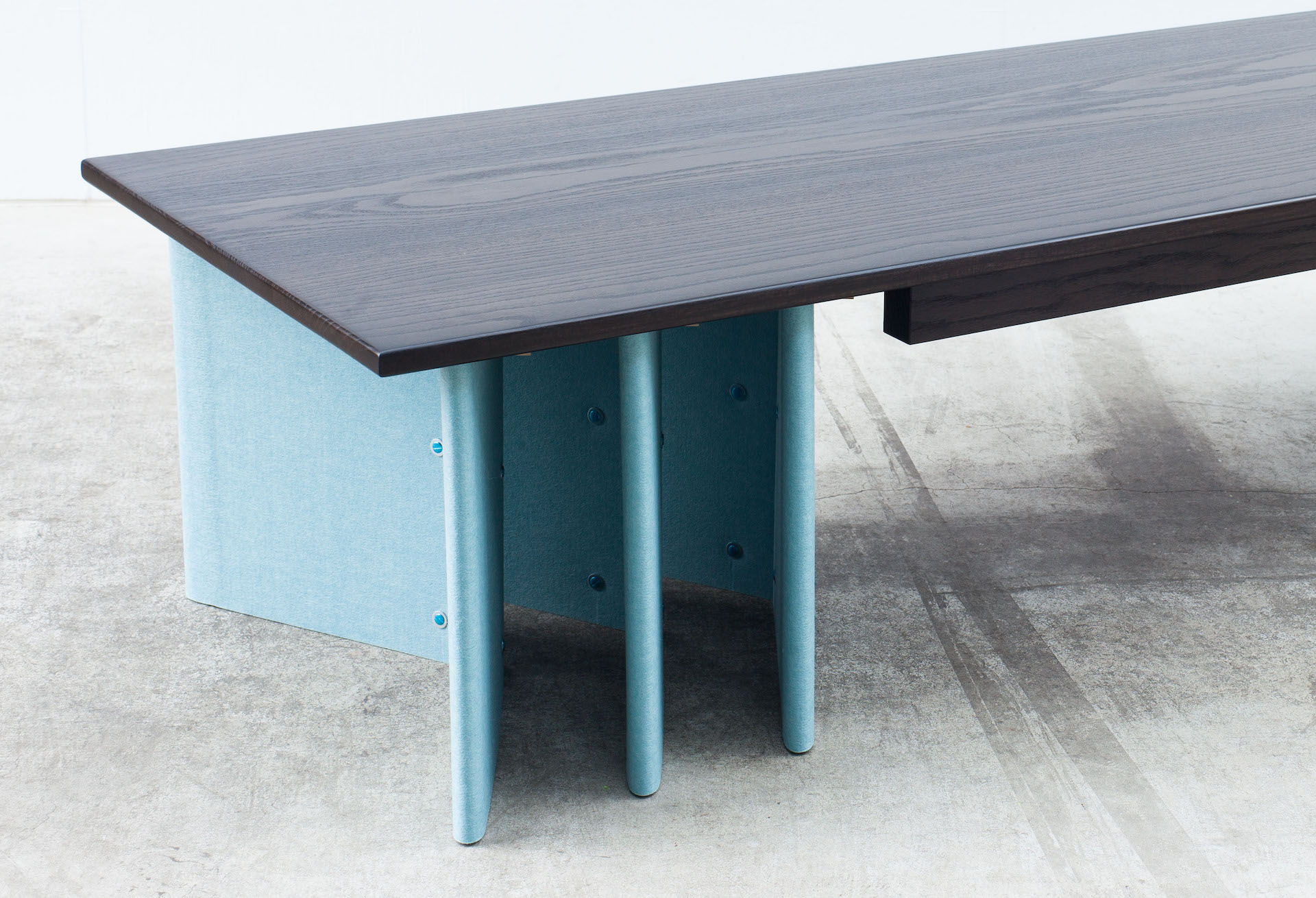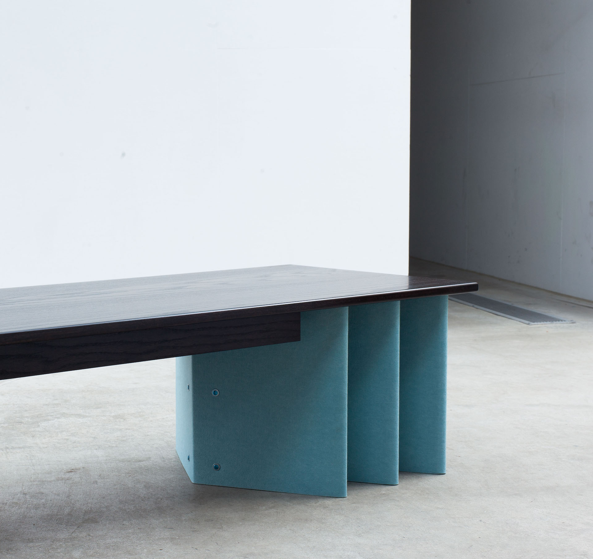 The solid oak top has been blackened and polished, muting some aspects of the timber's characteristics while simultaneously highlighting others.